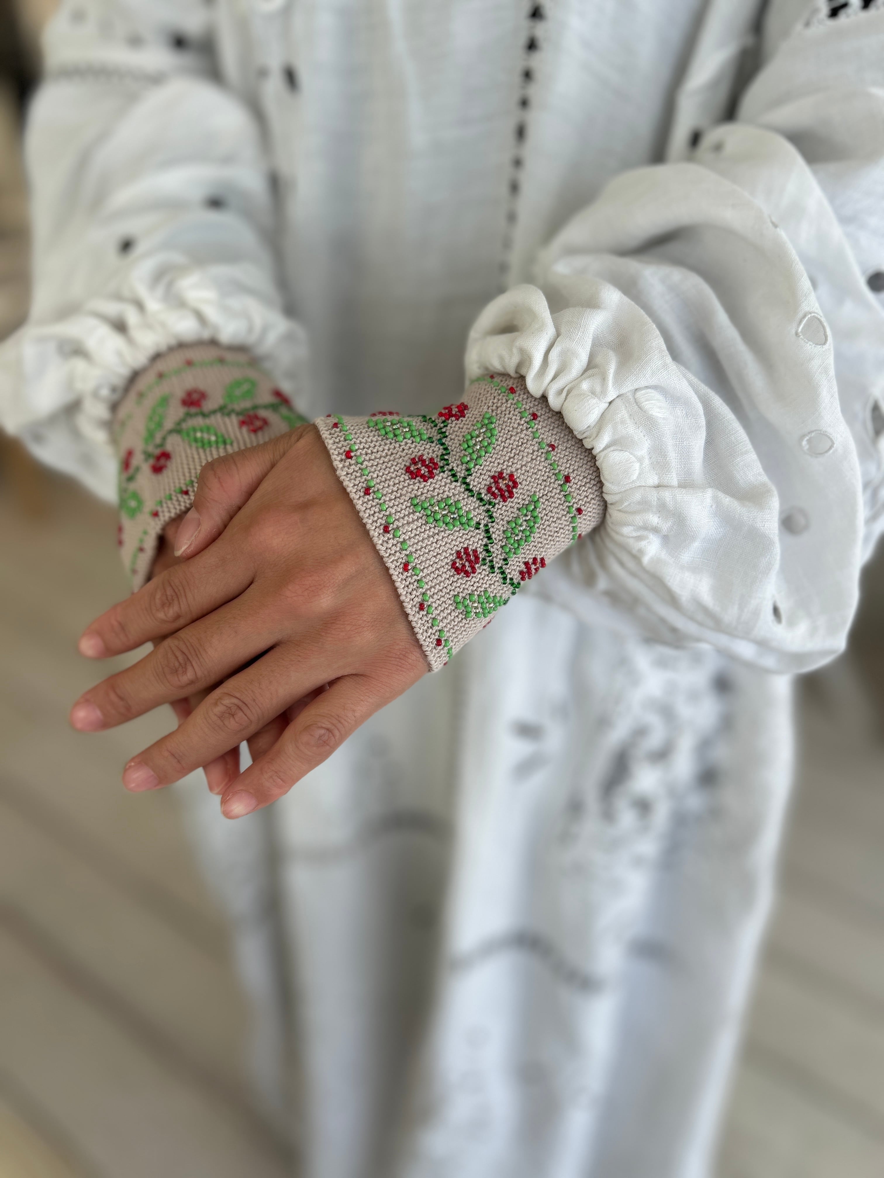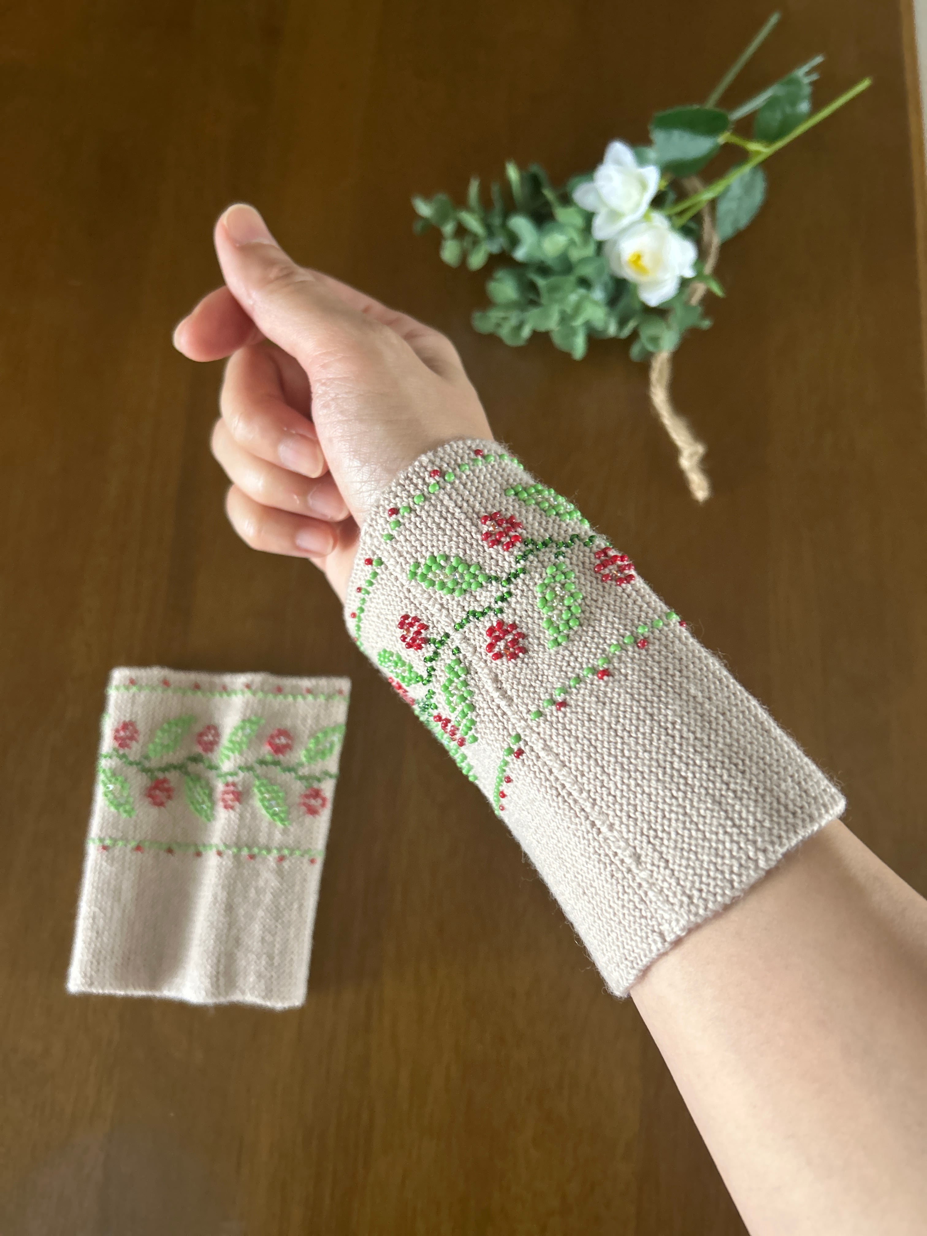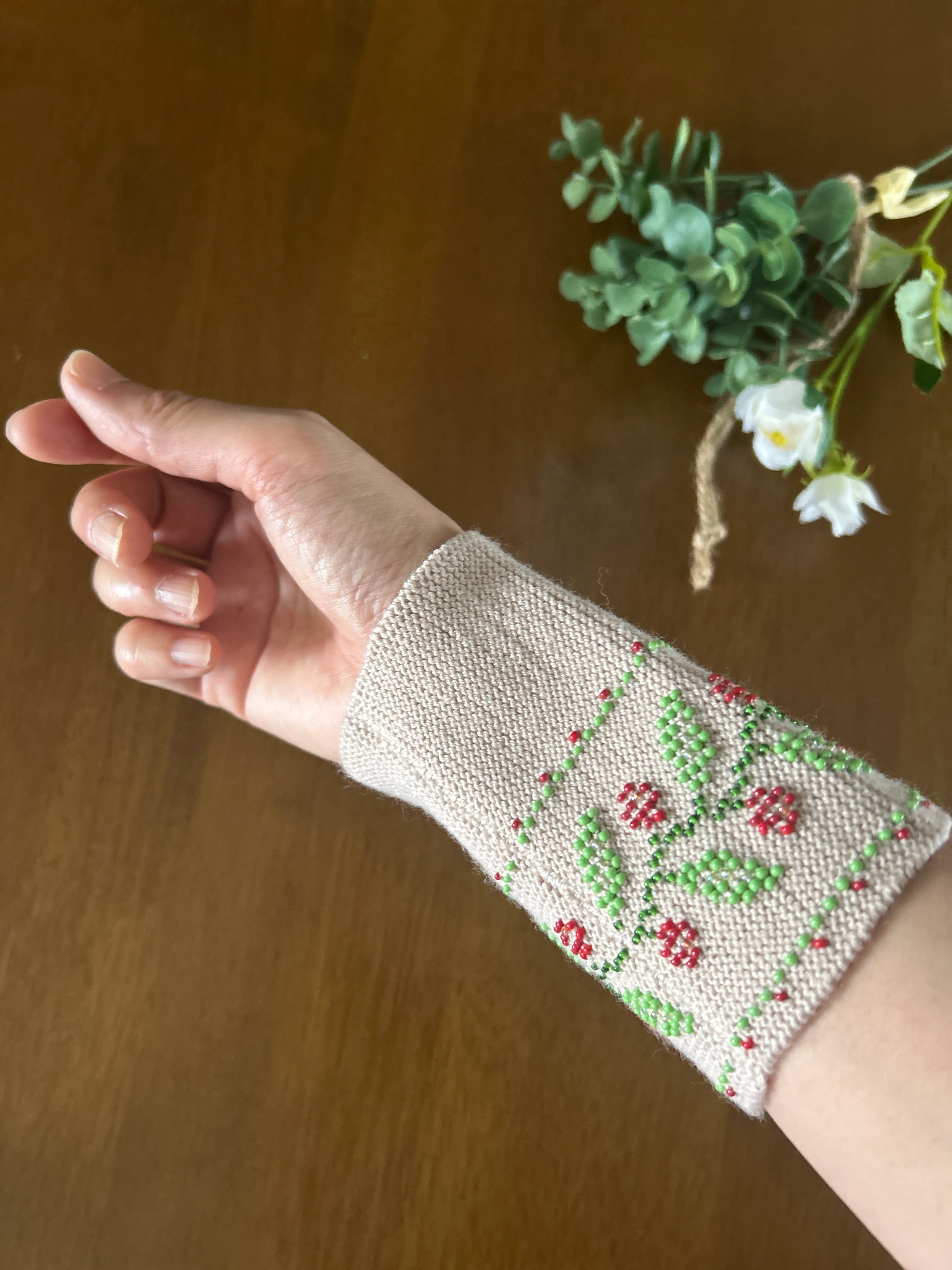 ビーズ編みのリストウォーマーは