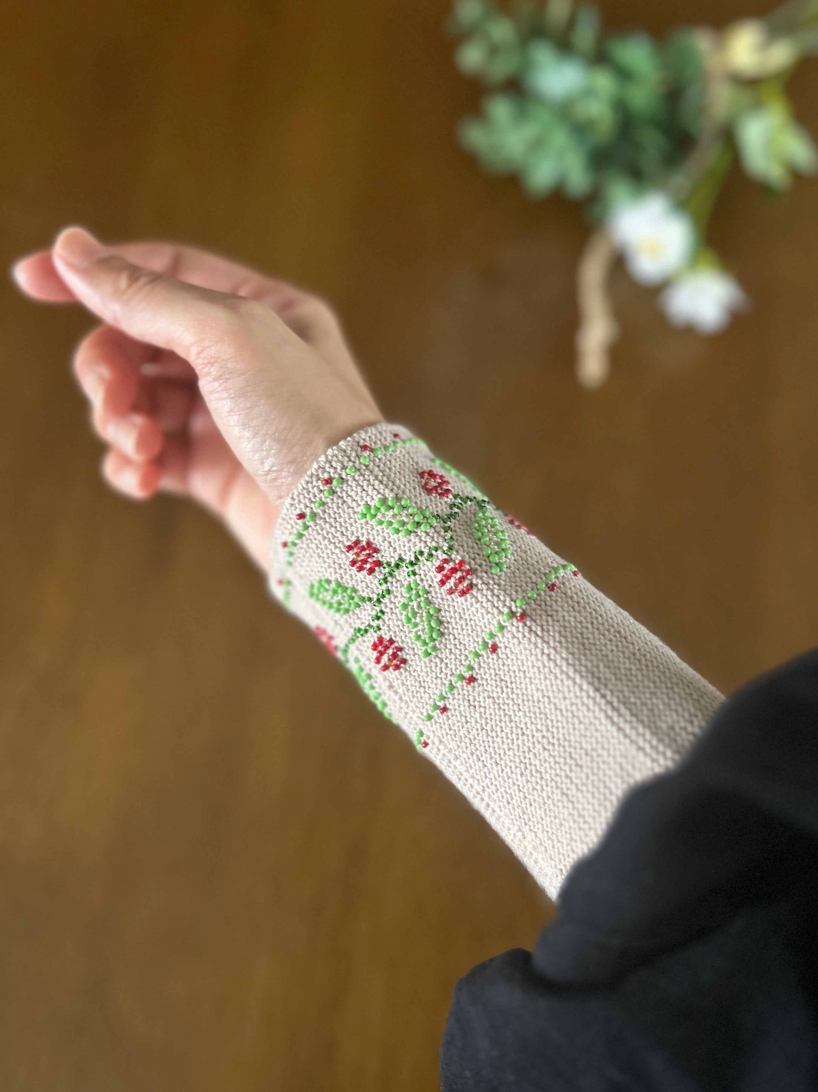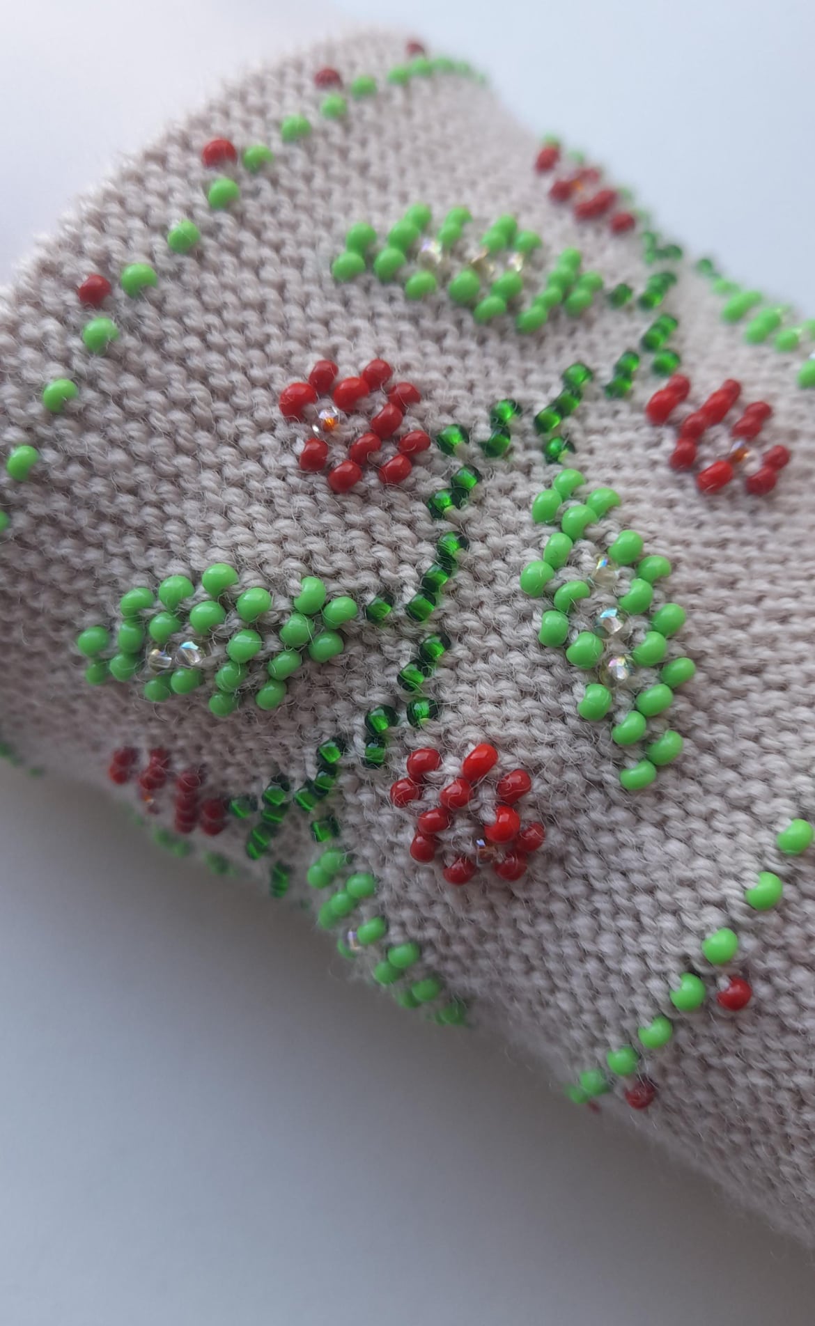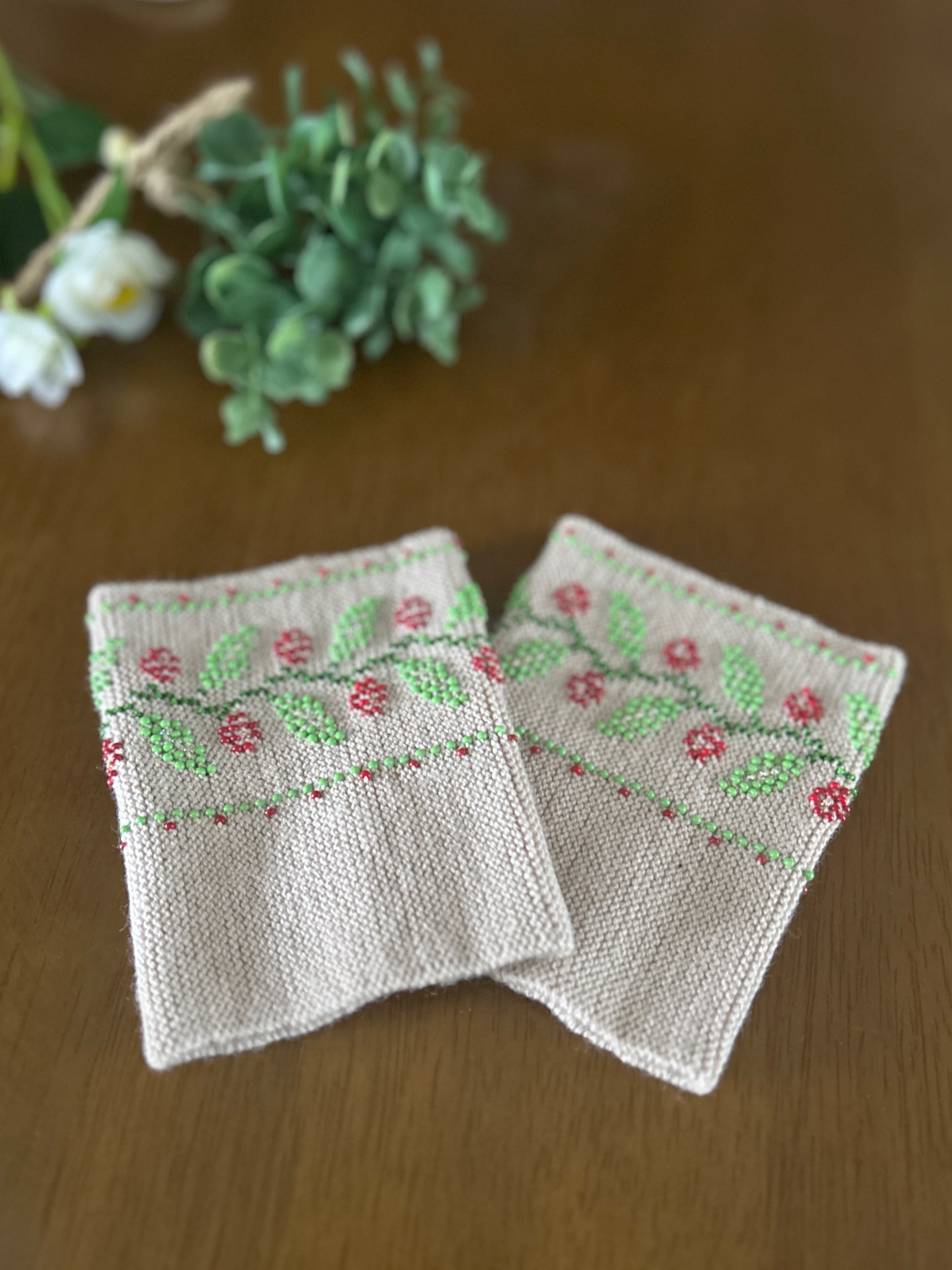 ビーズ編みのリストウォーマーは